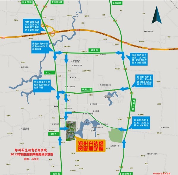 九、来校乘车说明:①仅在通知的新生报到日内,从早7:30至18:00,学院在郑州火车站西出站口设有新生接待站。②其他时间,新生可在郑州火车站西出站口乘551路公交车终点站即到升达。③乘飞机到新郑国际机场的考生,可在机场乘坐出租车到学院报到(费用60元左右)。④自驾车的考生高速公路转入郑州西南绕城高速公路(G3001)后,在十八里河出口出站,然后向新郑方向约4公里即到。