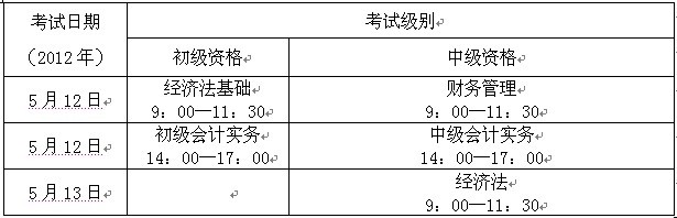 二、2012年度河南省会计专业技术资格考试级别、科目、时间安排表