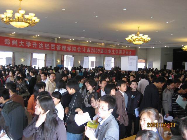 2009年4月9日,春风荡漾,暖意浓浓,郑州大学升达经贸管理学院会计系2009届毕业生供需见面会在龙湖报告厅成功举行,此次供需见面会由张洁副院长领导和策划、会计系主办,面向全院毕业生进行。院党委常务副书记戎庭银、副院长张金安等领导亲自到场了解招聘相关情况,与用人单位当面交流,听取用人单位对毕业生的招聘意见。