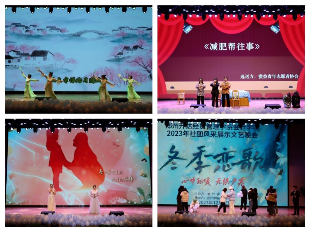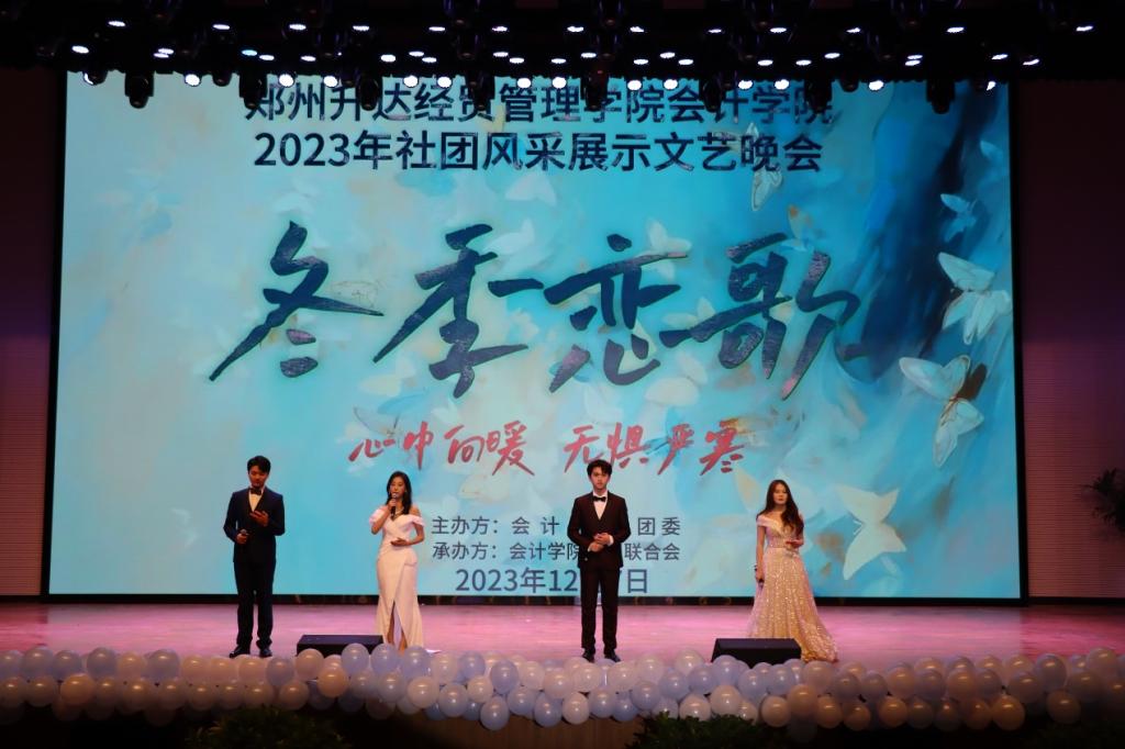 为丰富同学们的校园文化生活,展现当代大学生的青春活力,郑州升达经贸管理学院于12月7日18:30在思源会馆举办2023年“冬季恋歌”社团风采展示文艺晚会。出席本次活动的有郑州升达经贸管理学院党委书记张蕾,郑州升达经贸管理学院行政秘书兼团委书记陈刚老师,校团委社团文体部负责人马悦老师,河南广亚教育基金会刘壮老师,郑州升达经贸管理学院团委副书记胡淑娟老师,22级年级团总支书记杨柳老师,23级年级团总支书记、资助工作专员、辅导员胡翔宇老师,各个学院教职工代表、主席团成员以及郑州升达经贸管理学院29届团学组织主要干部。