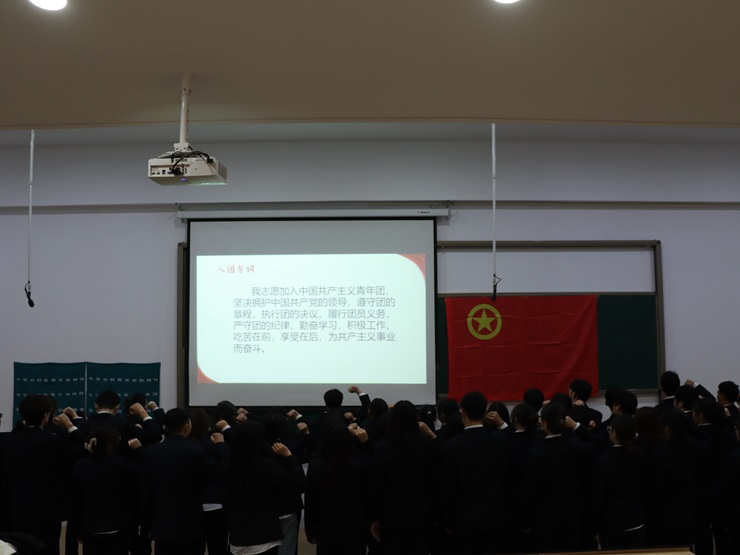仪式在庄严的国歌中拉开帷幕,然后胡淑娟老师宣读了新发展团员名单,接着伴随着共青团团歌,胡淑娟老师、杨柳老师和刘瑞雯老师为新发展团员佩戴团徽。随后组织部副部长李家和带领新发展团员在共青团团旗下庄严宣誓,主持人田浩然宣读团员义务和权利团章规定,筑牢团员的思想根基,帮助团员进一步提升自身素质,原航作为新发展团员代表进行发言,黄文浩作为老团员代表发言,给予了新发展团员鼓励。最后陈刚老师发言,陈刚老师希望新团员们拥有阳光心态,以积极的心态应对人生的一切艰难险阻,创造崭新的生活。