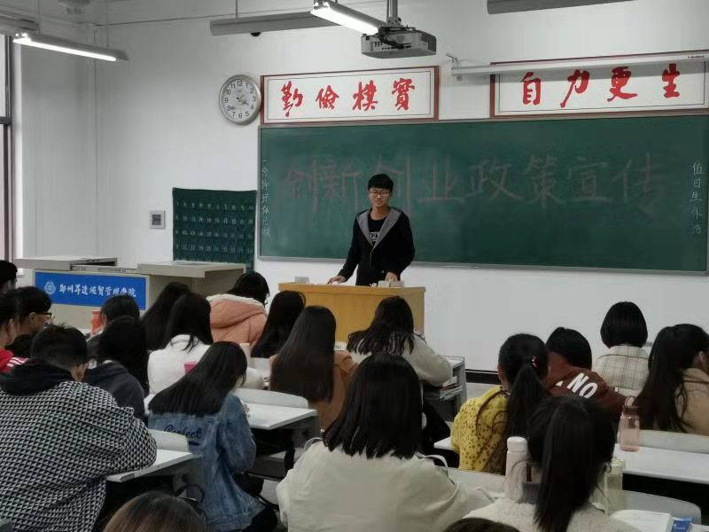 郑州升达经贸管理学院双创专员陈晓老师在接到大赛通知后,第一时间于2019年10月29日在学院内进行宣传和动员,并告知各班材料上交事项和项目计划书书写要求。